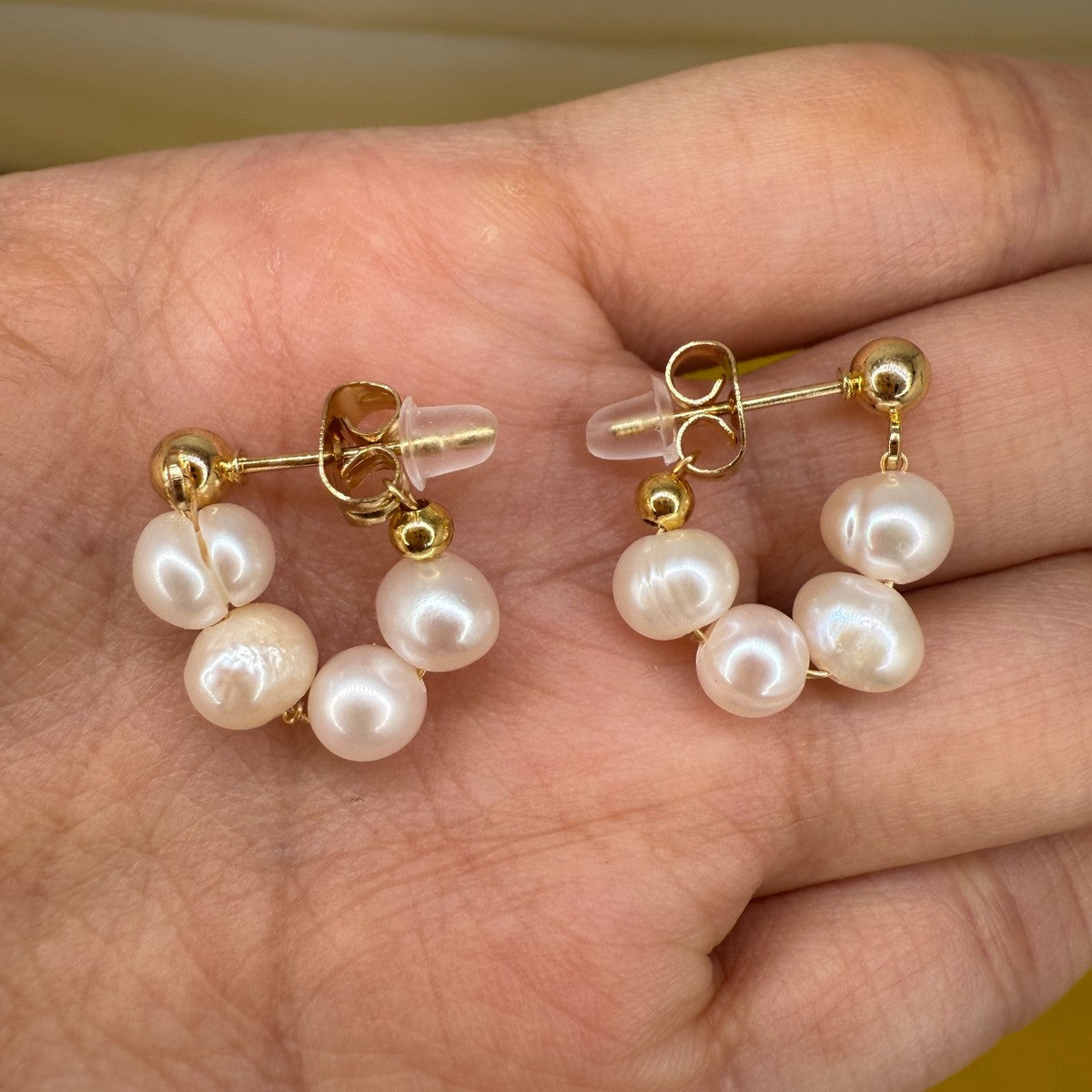 Estos exquisitos pendientes están elaborados a mano con amor utilizando baño enoro de 18k para una mayor durabilidad y brillo. Sus perlas de nácar dulce tienen un brillo iridiscente que refleja la luz de forma hermosa, resaltando tu estilo y nunca se descolora.